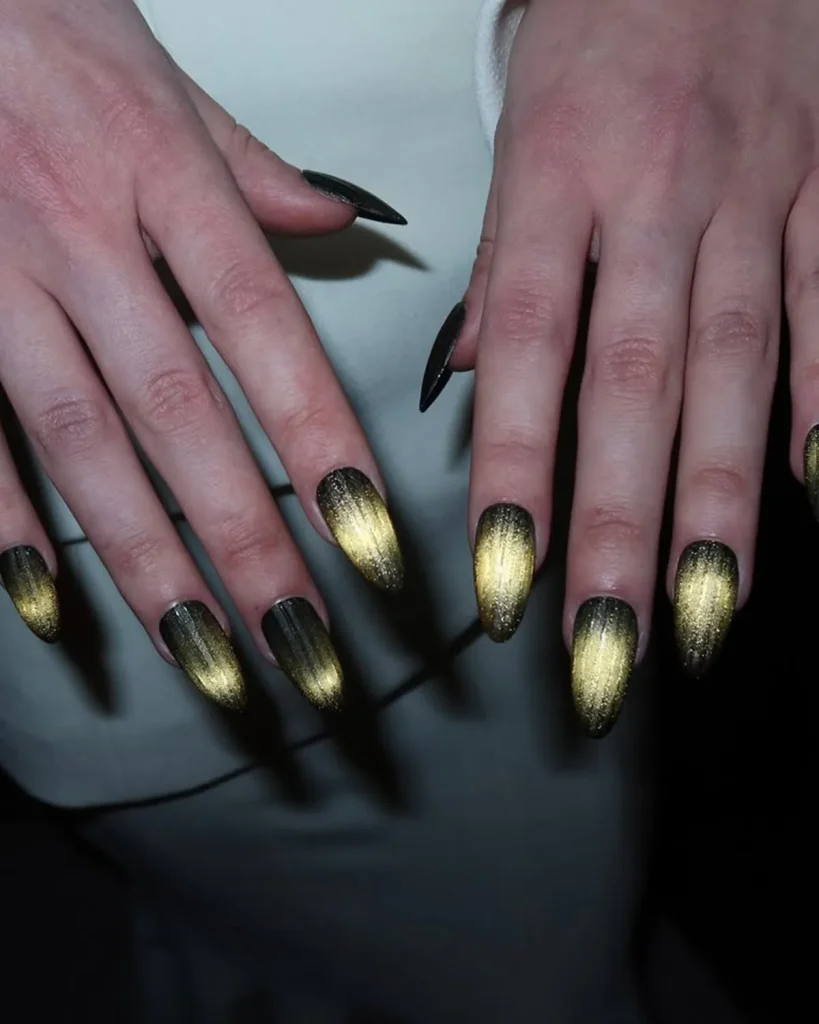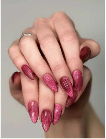 To create the look, Chue recommends, mentally divide the nail into three or four sections, and work in stages with a magnetic polish. (We’re big fans of the DND 9D Cat Eye Glassball polishes for their glossy finish and long wear time.) “Apply the polish one section at a time, use your magnet to create the cat-eye at whatever angle you like, then cure before moving on,” she explains. “Repeat until the entire nail is covered, then finish with a high-gloss gel topcoat.” The sectional approach allows the light-reflecting pigments to shift in multiple directions, enhancing that silk-like movement.